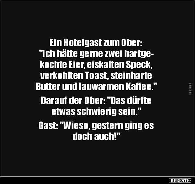 Ein Hotelgast zum Ober: "Ich hätte gerne zwei hartge- kochte Eier, eiskalten Speck, verkohlten Toast, steinharte Butter und lauwarmen Kaffee." Darauf der Ober: "Das dürfte etwas schwierig sein." Gast: "Wieso, gestern ging es doch auch!"