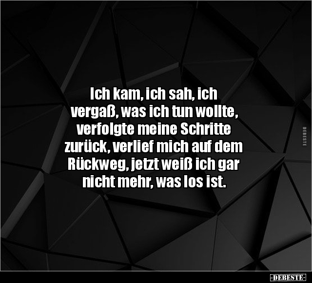 Ich kam, ich sah, ich vergaß, was ich tun wollte, verfolgte meine Schritte zurück, verlief mich auf dem Rückweg, jetzt weiß ich gar nicht mehr, was los ist.