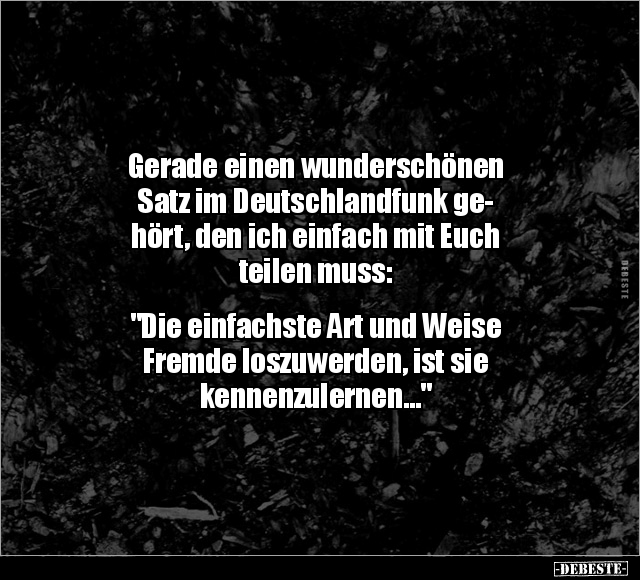 Gerade einen wunderschönen Satz im Deutschlandfunk ge- hört, den ich einfach mit Euch teilen muss: "Die einfachste Art und Weise Fremde loszuwerden, ist sie kennenzulernen..."