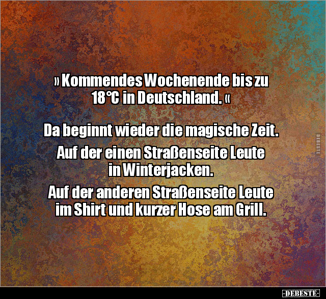 » Kommendes Wochenende bis zu 18°C in Deutschland. « Da beginnt wieder die magische Zeit. Auf der einen Straßenseite Leute in Winterjacken. Auf der anderen Straßenseite Leute im Shirt und kurzer Hose am Grill.