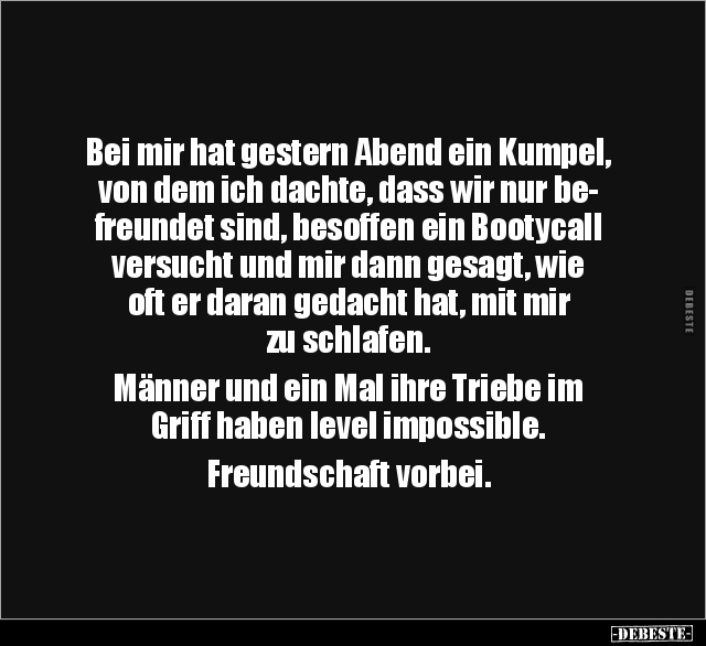 Bei mir hat gestern Abend ein Kumpel, von dem ich dachte, dass wir nur be- freundet sind, besoffen ein Bootycall versucht und mir dann gesagt, wie oft er daran gedacht hat, mit mir zu schlafen. Männer und ein Mal ihre Triebe im Griff haben level impossible. Freundschaft vorbei.