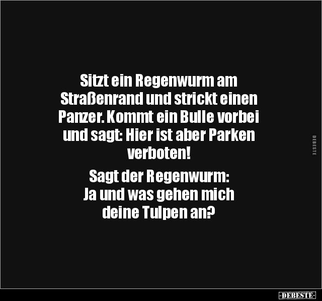 Sitzt ein Regenwurm am Straßenrand und strickt einen Panzer. Kommt ein Bulle vorbei und sagt: Hier ist aber Parken verboten! Sagt der Regenwurm: Ja und was gehen mich deine Tulpen an?