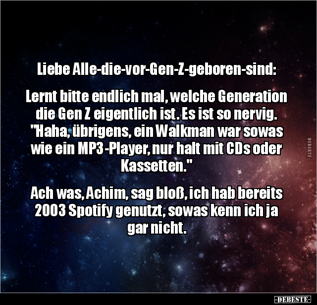 Liebe Alle-die-vor-Gen-Z-geboren-sind: Lernt bitte endlich mal, welche Generation die Gen Z eigentlich ist. Es ist so nervig. "Haha, übrigens, ein Walkman war sowas wie ein MP3-Player, nur halt mit CDs oder Kassetten." Ach was, Achim, sag bloß, ich hab bereits 2003 Spotify genutzt, sowas kenn ich ja gar nicht.