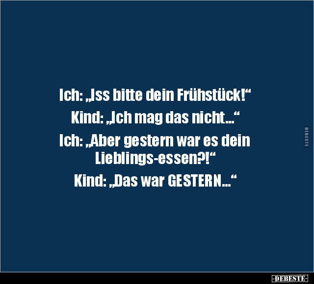 Ich: „Iss bitte dein Frühstück!“ Kind: „Ich mag das nicht…“ Ich: „Aber gestern war es dein Lieblings-essen?!“ Kind: „Das war GESTERN…“