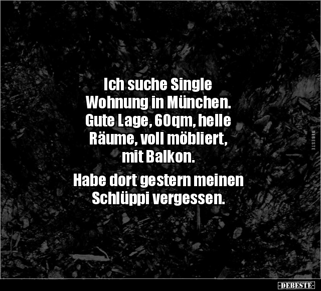Ich suche Single Wohnung in München. Gute Lage, 60qm, helle Räume, voll möbliert, mit Balkon. Habe dort gestern meinen Schlüppi vergessen.