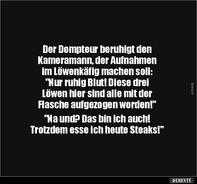 Der Dompteur beruhigt den Kameramann, der Aufnahmen im Löwenkäfig machen soll: "Nur ruhig Blut! Diese drei Löwen hier sind alle mit der Flasche aufgezogen worden!" "Na und? Das bin ich auch! Trotzdem esse ich heute Steaks!"