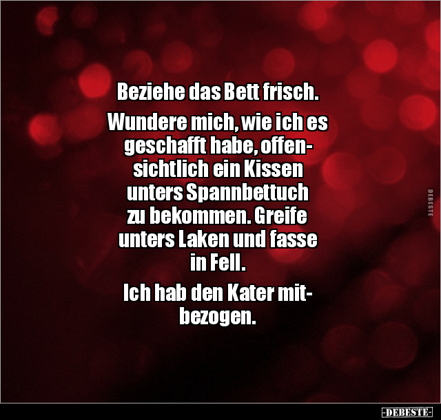 Beziehe das Bett frisch. Wundere mich, wie ich es geschafft habe, offen- sichtlich ein Kissen unters Spannbettuch zu bekommen. Greife unters Laken und fasse in Fell. Ich hab den Kater mit- bezogen.