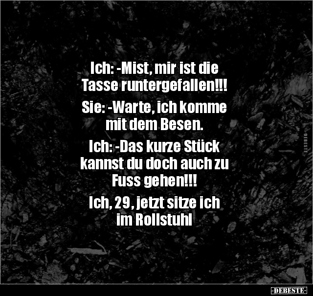 Ich: -Mist, mir ist die Tasse runtergefallen!!! Sie: -Warte, ich komme mit dem Besen. Ich: -Das kurze Stück kannst du doch auch zu Fuss gehen!!! Ich, 29, jetzt sitze ich im Rollstuhl