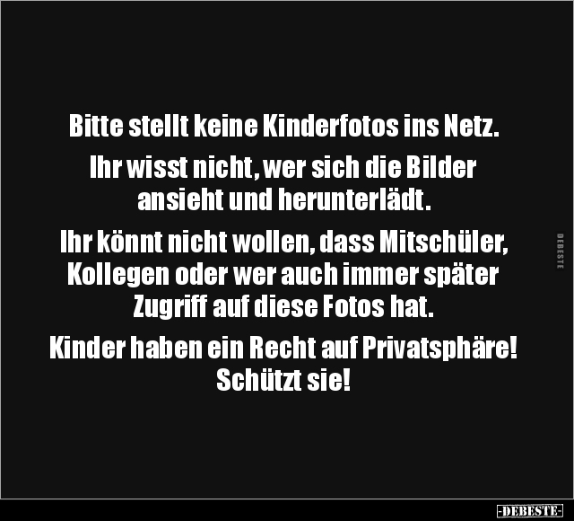 Bitte stellt keine Kinderfotos ins Netz. Ihr wisst nicht, wer sich die Bilder ansieht und herunterlädt. Ihr könnt nicht wollen, dass Mitschüler, Kollegen oder wer auch immer später Zugriff auf diese Fotos hat. Kinder haben ein Recht auf Privatsphäre! Schützt sie!