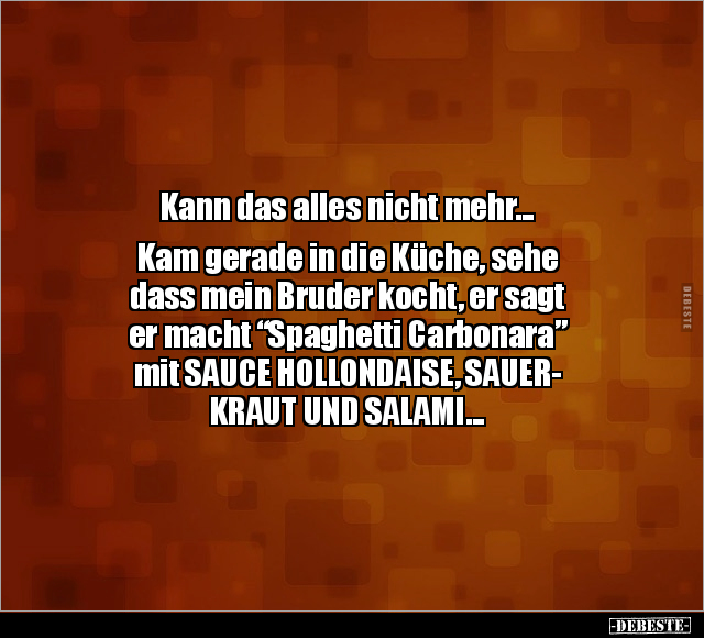 Kann das alles nicht mehr... Kam gerade in die Küche, sehe dass mein Bruder kocht, er sagt er macht “Spaghetti Carbonara” mit SAUCE HOLLONDAISE, SAUER- KRAUT UND SALAMI...