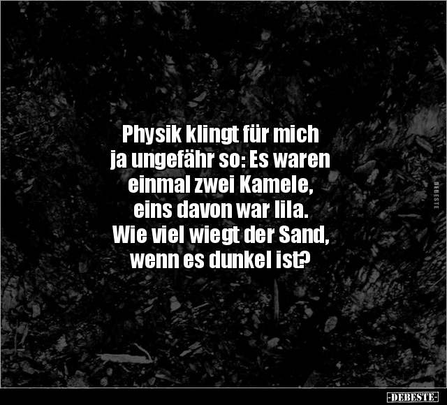 Physik klingt für mich ja ungefähr so: Es waren einmal zwei Kamele, eins davon war lila. Wie viel wiegt der Sand, wenn es dunkel ist?