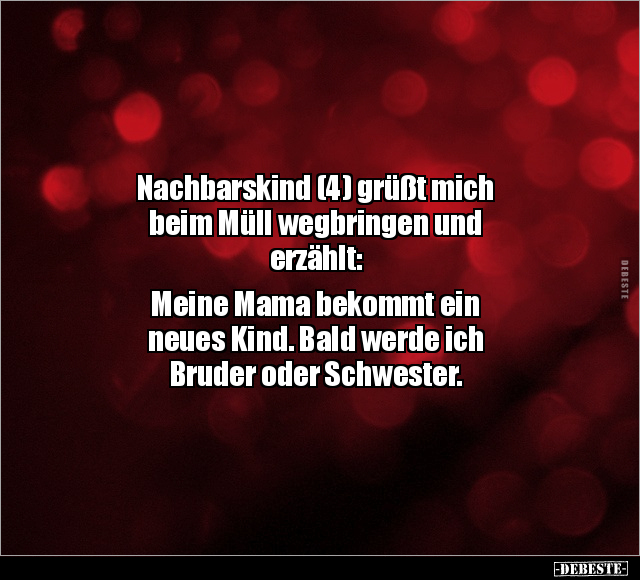 Nachbarskind (4) grüßt mich beim Müll wegbringen und erzählt: Meine Mama bekommt ein neues Kind. Bald werde ich Bruder oder Schwester.
