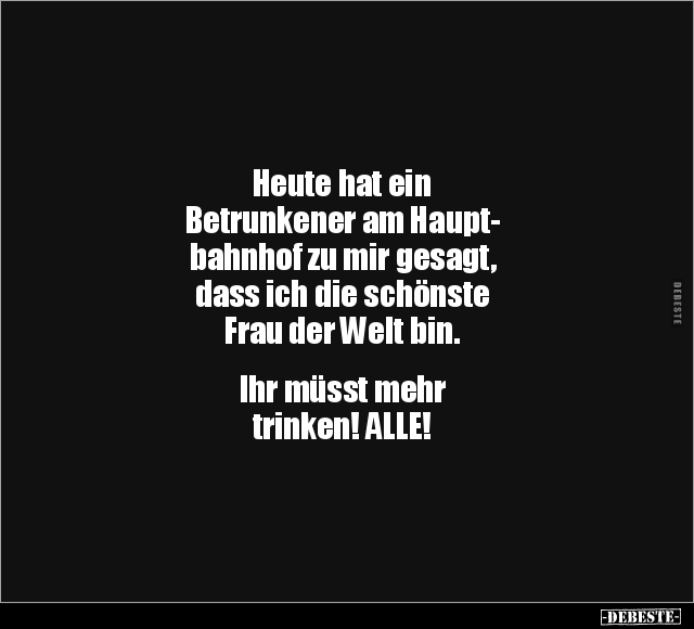 Heute hat ein Betrunkener am Haupt- bahnhof zu mir gesagt, dass ich die schönste Frau der Welt bin. Ihr müsst mehr trinken! ALLE!