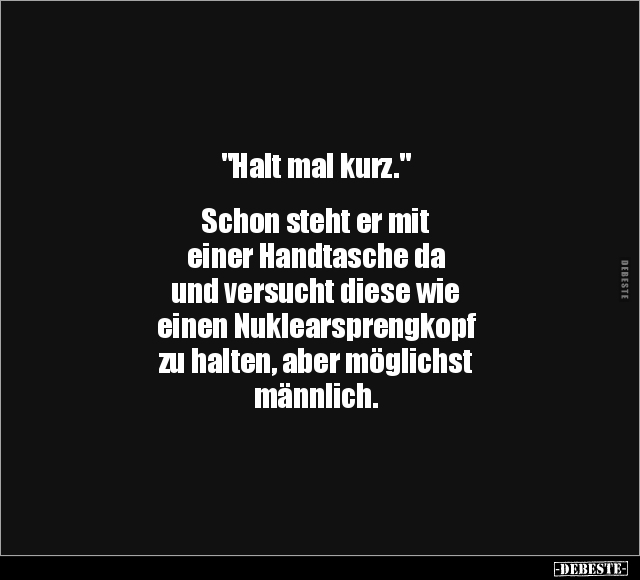 "Halt mal kurz." Schon steht er mit einer Handtasche da und versucht diese wie einen Nuklearsprengkopf zu halten, aber möglichst männlich.