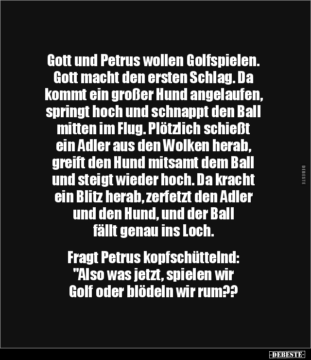 Gott und Petrus wollen Golfspielen. Gott macht den ersten Schlag. Da kommt ein großer Hund angelaufen, springt hoch und schnappt den Ball mitten im Flug. Plötzlich schießt ein Adler aus den Wolken herab, greift den Hund mitsamt dem Ball und steigt wieder hoch. Da kracht ein Blitz herab, zerfetzt den Adler und den Hund, und der Ball fällt genau ins Loch. Fragt Petrus kopfschüttelnd: "Also was jetzt, spielen wir Golf oder blödeln wir rum??