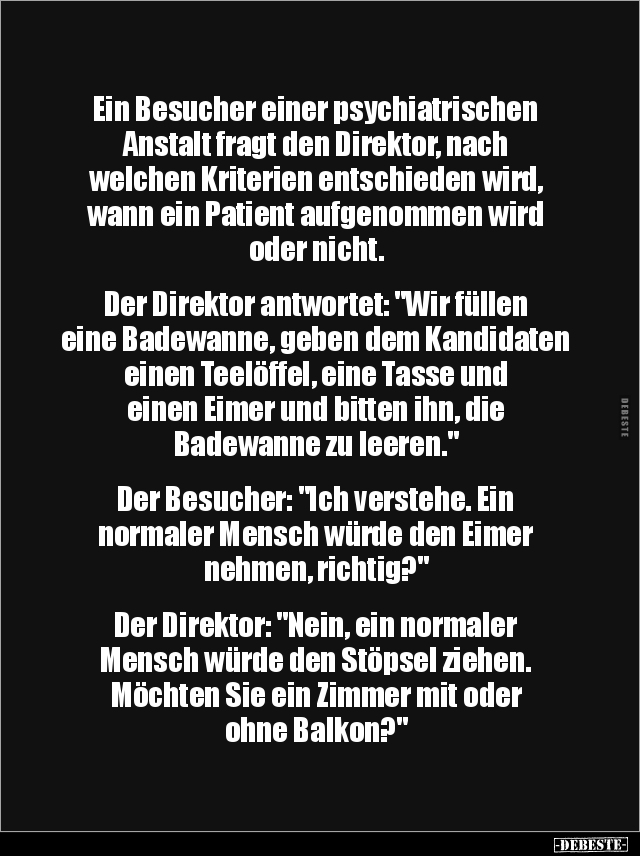 Ein Besucher einer psychiatrischen Anstalt fragt den Direktor, nach welchen Kriterien entschieden wird, wann ein Patient aufgenommen wird oder nicht. Der Direktor antwortet: "Wir füllen eine Badewanne, geben dem Kandidaten einen Teelöffel, eine Tasse und einen Eimer und bitten ihn, die Badewanne zu leeren." Der Besucher: "Ich verstehe. Ein normaler Mensch würde den Eimer nehmen, richtig?" Der Direktor: "Nein, ein normaler Mensch würde den Stöpsel ziehen. Möchten Sie ein Zimmer mit oder ohne Balkon?"
