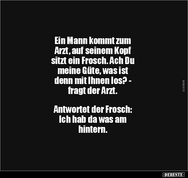 Ein Mann kommt zum Arzt, auf seinem Kopf sitzt ein Frosch. Ach Du meine Güte, was ist denn mit Ihnen los? - fragt der Arzt. Antwortet der Frosch: Ich hab da was am hintern.