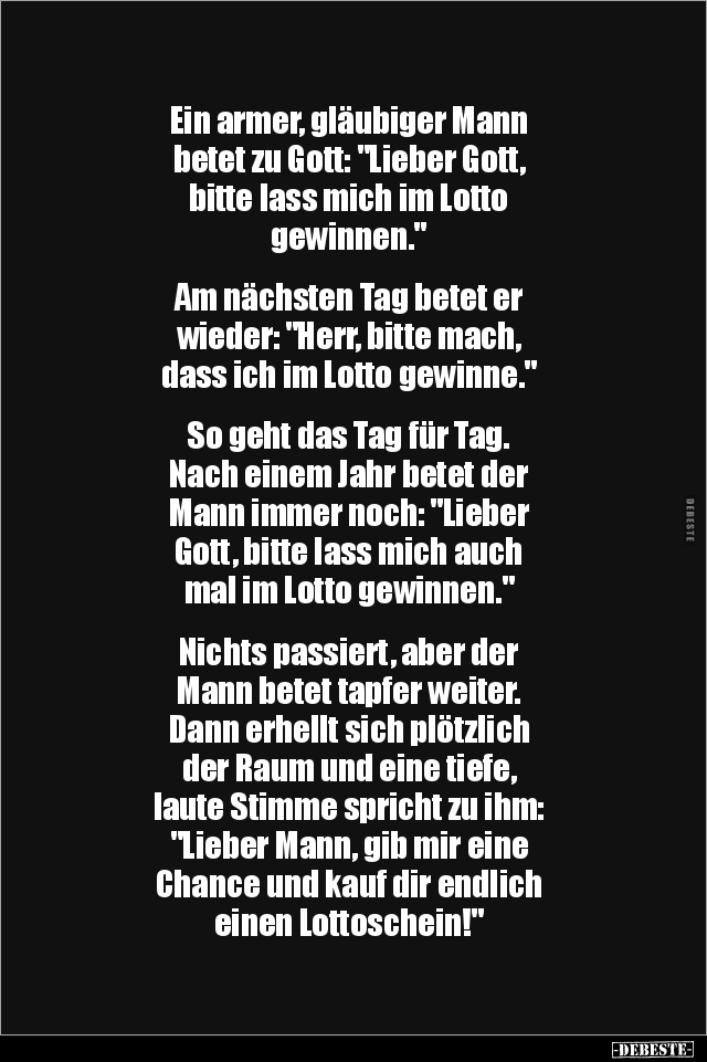 Ein armer, gläubiger Mann betet zu Gott: "Lieber Gott, bitte lass mich im Lotto gewinnen." Am nächsten Tag betet er wieder: "Herr, bitte mach, dass ich im Lotto gewinne." So geht das Tag für Tag. Nach einem Jahr betet der Mann immer noch: "Lieber Gott, bitte lass mich auch mal im Lotto gewinnen." Nichts passiert, aber der Mann betet tapfer weiter. Dann erhellt sich plötzlich der Raum und eine tiefe, laute Stimme spricht zu ihm: "Lieber Mann, gib mir eine Chance und kauf dir endlich einen Lottoschein!"