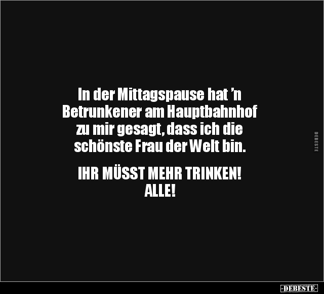 In der Mittagspause hat ’n Betrunkener am Hauptbahnhof zu mir gesagt, dass ich die schönste Frau der Welt bin. IHR MÜSST MEHR TRINKEN! ALLE!