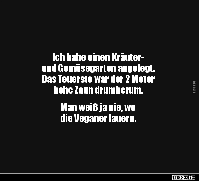 Ich habe einen Kräuter- und Gemüsegarten angelegt. Das Teuerste war der 2 Meter hohe Zaun drumherum. Man weiß ja nie, wo die Veganer lauern.