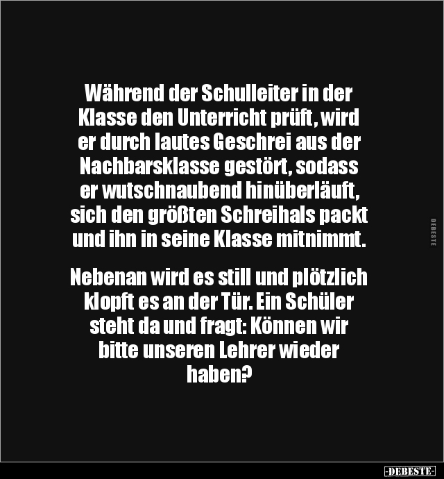 Während der Schulleiter in der Klasse den Unterricht prüft, wird er durch lautes Geschrei aus der Nachbarsklasse gestört, sodass er wutschnaubend hinüberläuft, sich den größten Schreihals packt und ihn in seine Klasse mitnimmt. Nebenan wird es still und plötzlich klopft es an der Tür. Ein Schüler steht da und fragt: Können wir bitte unseren Lehrer wieder haben?
