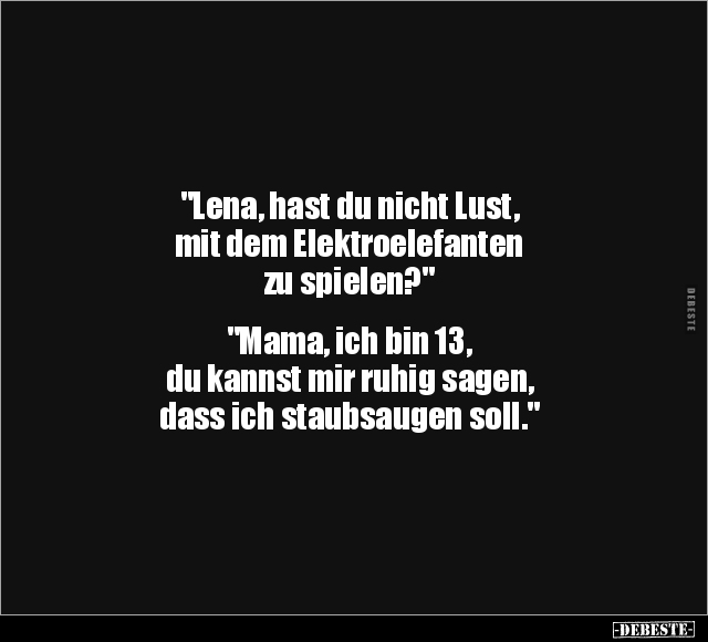 "Lena, hast du nicht Lust, mit dem Elektroelefanten zu spielen?" "Mama, ich bin 13, du kannst mir ruhig sagen, dass ich staubsaugen soll."