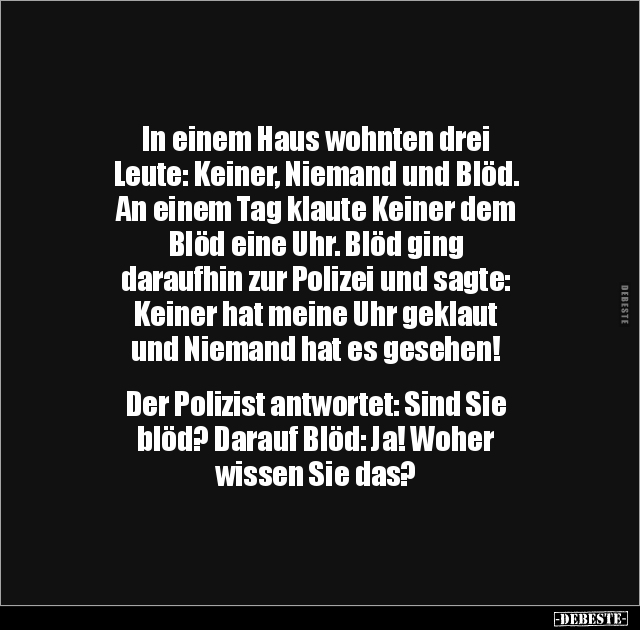 In einem Haus wohnten drei Leute: Keiner, Niemand und Blöd. An einem Tag klaute Keiner dem Blöd eine Uhr. Blöd ging daraufhin zur Polizei und sagte: Keiner hat meine Uhr geklaut und Niemand hat es gesehen! Der Polizist antwortet: Sind Sie blöd? Darauf Blöd: Ja! Woher wissen Sie das?