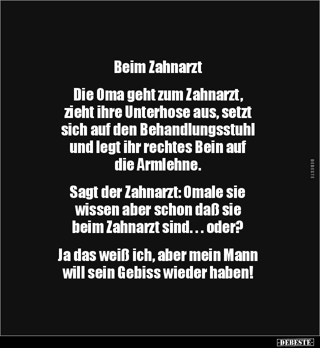 Beim Zahnarzt Die Oma geht zum Zahnarzt, zieht ihre Unterhose aus, setzt sich auf den Behandlungsstuhl und legt ihr rechtes Bein auf die Armlehne. Sagt der Zahnarzt: Omale sie wissen aber schon daß sie beim Zahnarzt sind. . . oder? Ja das weiß ich, aber mein Mann will sein Gebiss wieder haben!