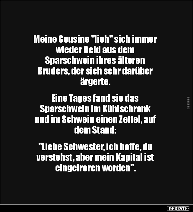 Meine Cousine "lieh" sich immer wieder Geld aus dem Sparschwein ihres älteren Bruders, der sich sehr darüber ärgerte. Eine Tages fand sie das Sparschwein im Kühlschrank und im Schwein einen Zettel, auf dem Stand: "Liebe Schwester, ich hoffe, du verstehst, aber mein Kapital ist eingefroren worden".