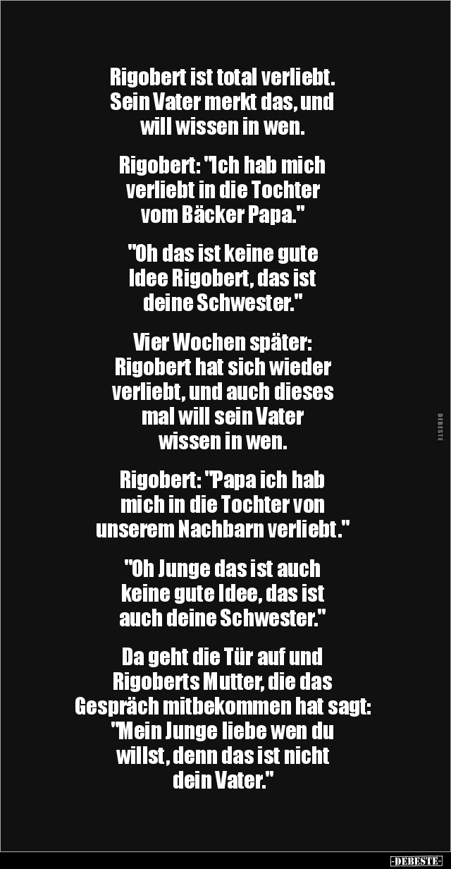 Rigobert ist total verliebt. Sein Vater merkt das, und will wissen in wen. Rigobert: "Ich hab mich verliebt in die Tochter vom Bäcker Papa." "Oh das ist keine gute Idee Rigobert, das ist deine Schwester." Vier Wochen später: Rigobert hat sich wieder verliebt, und auch dieses mal will sein Vater wissen in wen. Rigobert: "Papa ich hab mich in die Tochter von unserem Nachbarn verliebt." "Oh Junge das ist auch keine gute Idee, das ist auch deine Schwester." Da geht die Tür auf und Rigoberts Mutter, die das Gespräch mitbekommen hat sagt: "Mein Junge liebe wen du willst, denn das ist nicht dein Vater."