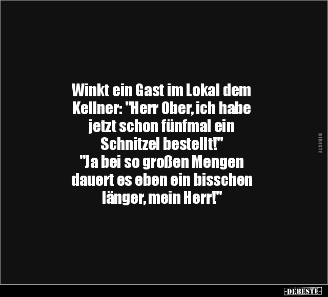 Winkt ein Gast im Lokal dem Kellner: "Herr Ober, ich habe jetzt schon fünfmal ein Schnitzel bestellt!" "Ja bei so großen Mengen dauert es eben ein bisschen länger, mein Herr!"