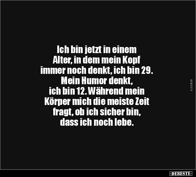 Ich bin jetzt in einem Alter, in dem mein Kopf immer noch denkt, ich bin 29. Mein Humor denkt, ich bin 12. Während mein Körper mich die meiste Zeit fragt, ob ich sicher bin, dass ich noch lebe.