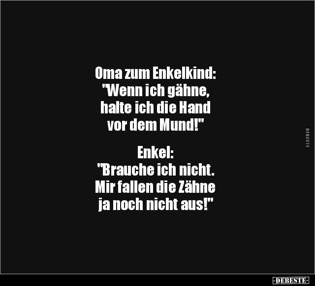 Oma zum Enkelkind: "Wenn ich gähne, halte ich die Hand vor dem Mund!" Enkel: "Brauche ich nicht. Mir fallen die Zähne ja noch nicht aus!"