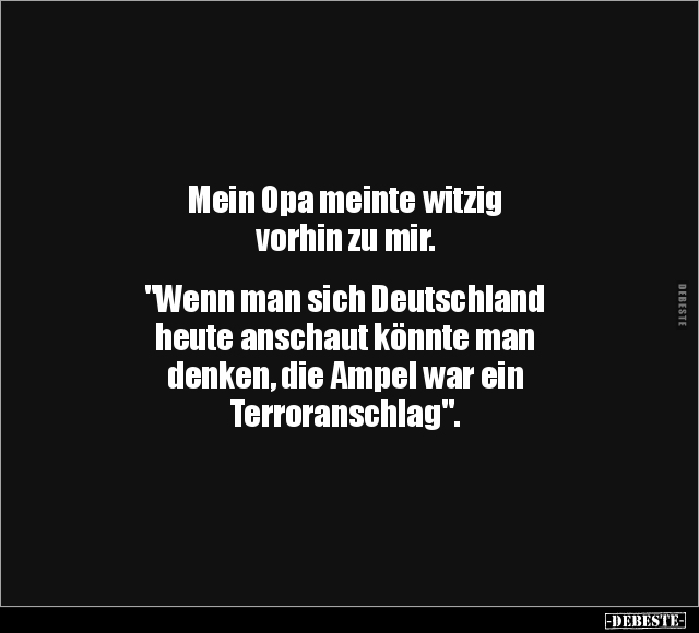 Mein Opa meinte witzig vorhin zu mir. "Wenn man sich Deutschland heute anschaut könnte man denken, die Ampel war ein Terroranschlag".