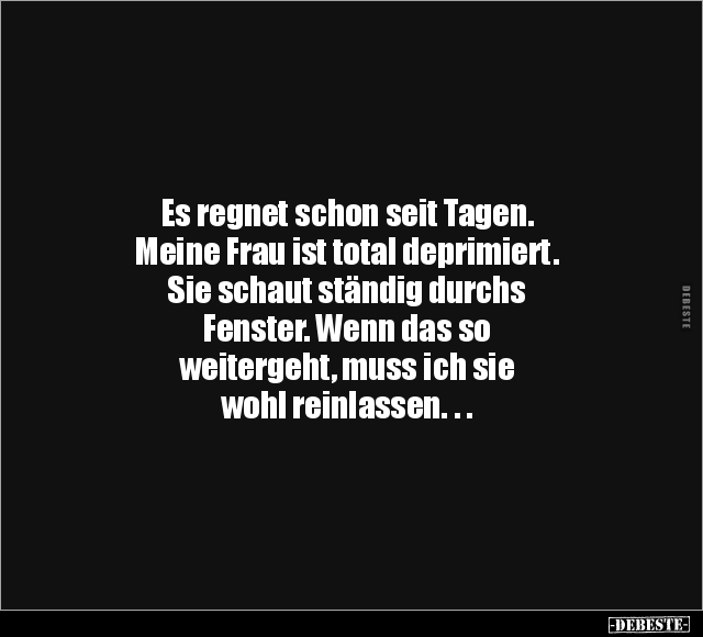 Es regnet schon seit Tagen. Meine Frau ist total deprimiert. Sie schaut ständig durchs Fenster. Wenn das so weitergeht, muss ich sie wohl reinlassen. . .
