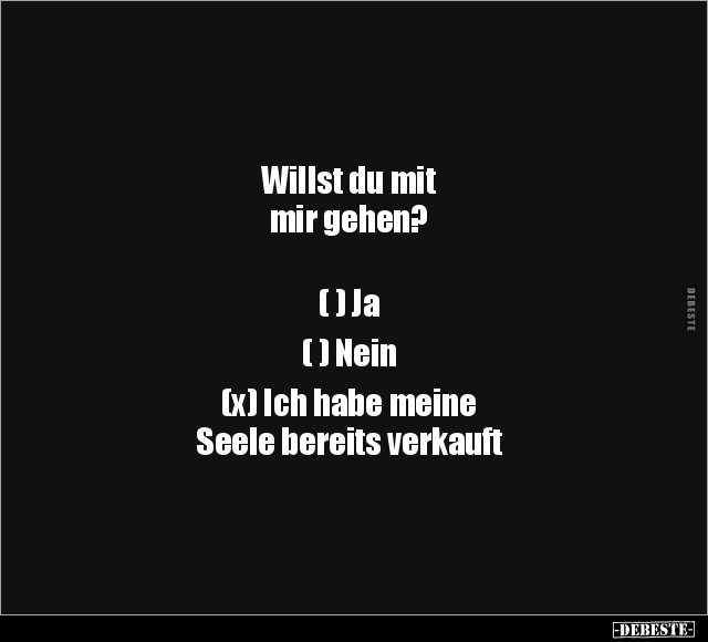 Willst du mit mir gehen? ( ) Ja ( ) Nein (x) Ich habe meine Seele bereits verkauft