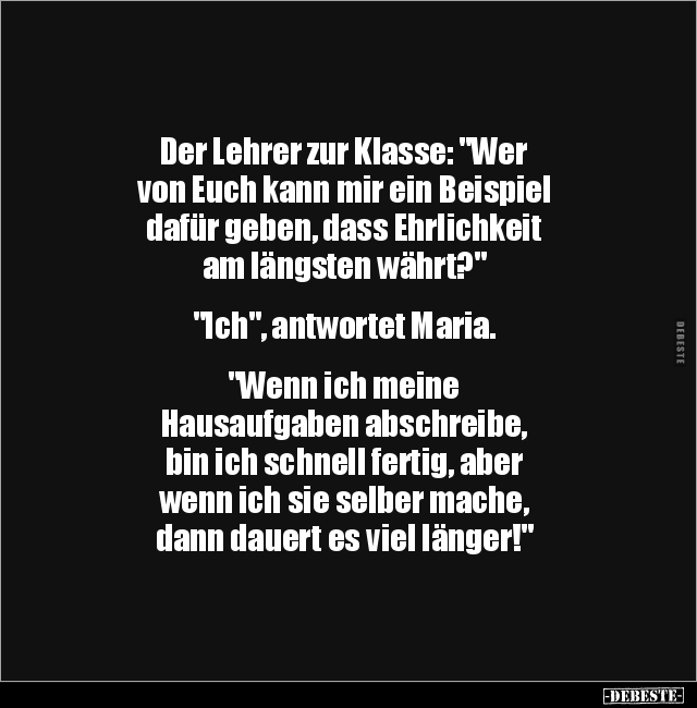 Der Lehrer zur Klasse: "Wer von Euch kann mir ein Beispiel dafür geben, dass Ehrlichkeit am längsten währt?" "Ich", antwortet Maria. "Wenn ich meine Hausaufgaben abschreibe, bin ich schnell fertig, aber wenn ich sie selber mache, dann dauert es viel länger!"