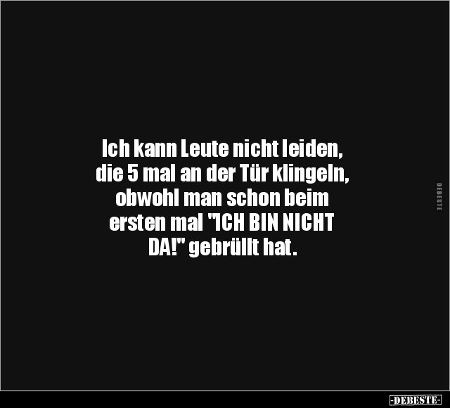 Ich kann Leute nicht leiden, die 5 mal an der Tür klingeln, obwohl man schon beim ersten mal "ICH BIN NICHT DA!" gebrüllt hat.