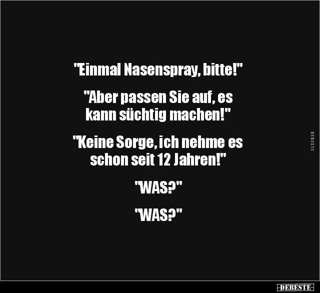 "Einmal Nasenspray, bitte!" "Aber passen Sie auf, es kann süchtig machen!" "Keine Sorge, ich nehme es schon seit 12 Jahren!" "WAS?" "WAS?"