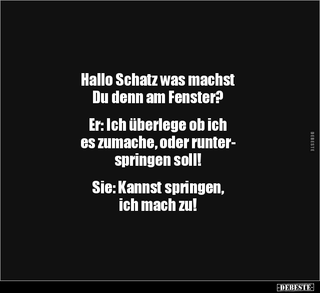 Hallo Schatz was machst Du denn am Fenster? Er: Ich überlege ob ich es zumache, oder runter- springen soll! Sie: Kannst springen, ich mach zu!