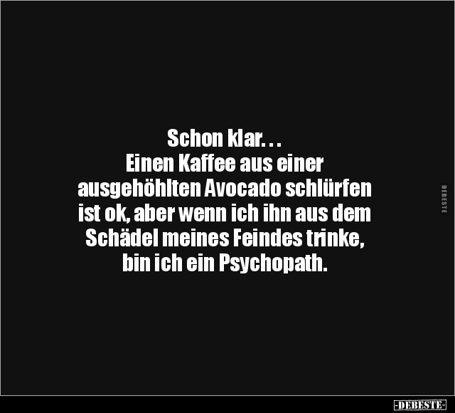 Schon klar. . . Einen Kaffee aus einer ausgehöhlten Avocado schlürfen ist ok, aber wenn ich ihn aus dem Schädel meines Feindes trinke, bin ich ein Psychopath.