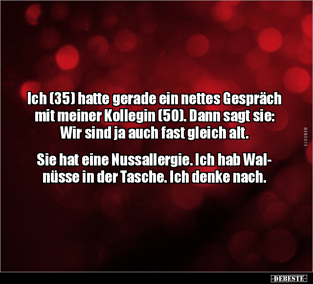 Ich (35) hatte gerade ein nettes Gespräch mit meiner Kollegin (50). Dann sagt sie: Wir sind ja auch fast gleich alt. Sie hat eine Nussallergie. Ich hab Wal- nüsse in der Tasche. Ich denke nach.