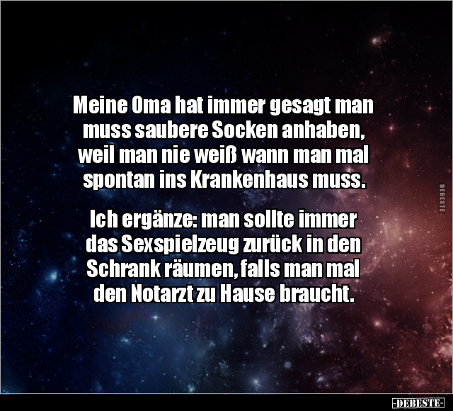 Meine Oma hat immer gesagt man muss saubere Socken anhaben, weil man nie weiß wann man mal spontan ins Krankenhaus muss. Ich ergänze: man sollte immer das Sexspielzeug zurück in den Schrank räumen, falls man mal den Notarzt zu Hause braucht.
