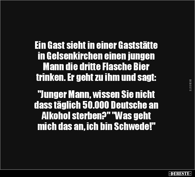 Ein Gast sieht in einer Gaststätte in Gelsenkirchen einen jungen Mann die dritte Flasche Bier trinken. Er geht zu ihm und sagt: "Junger Mann, wissen Sie nicht dass täglich 50.000 Deutsche an Alkohol sterben?" "Was geht mich das an, ich bin Schwede!"