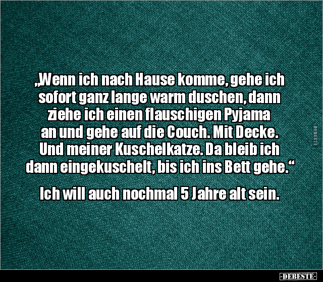 „Wenn ich nach Hause komme, gehe ich sofort ganz lange warm duschen, dann ziehe ich einen flauschigen Pyjama an und gehe auf die Couch. Mit Decke. Und meiner Kuschelkatze. Da bleib ich dann eingekuschelt, bis ich ins Bett gehe.“ Ich will auch nochmal 5 Jahre alt sein.