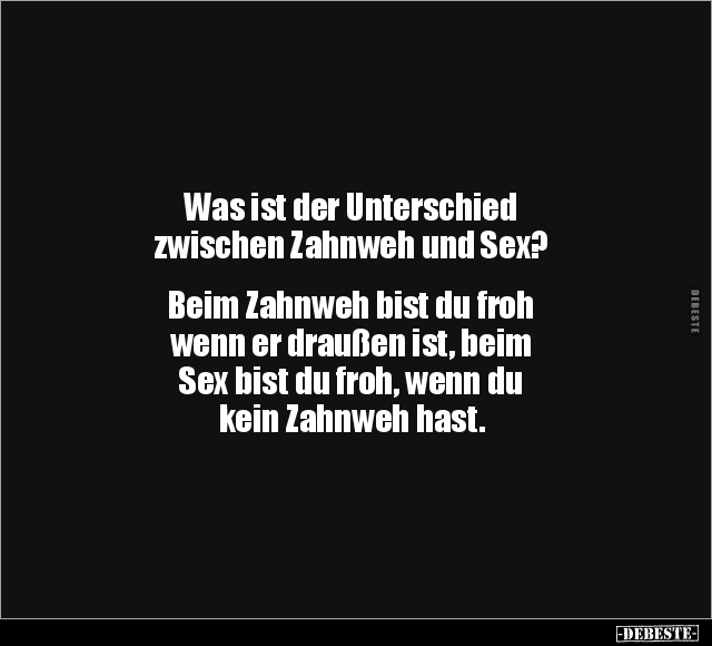 Was ist der Unterschied zwischen Zahnweh und Sex? Beim Zahnweh bist du froh wenn er draußen ist, beim Sex bist du froh, wenn du kein Zahnweh hast.