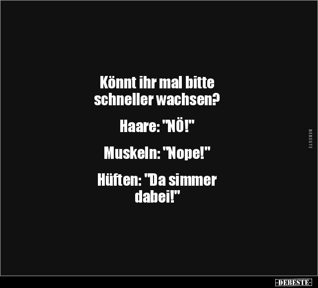 Könnt ihr mal bitte schneller wachsen? Haare: "NÖ!" Muskeln: "Nope!" Hüften: "Da simmer dabei!"