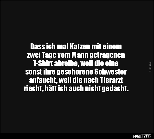 Dass ich mal Katzen mit einem zwei Tage vom Mann getragenen T-Shirt abreibe, weil die eine sonst ihre geschorene Schwester anfaucht, weil die nach Tierarzt riecht, hätt ich auch nicht gedacht.