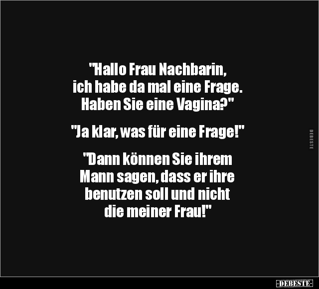 "Hallo Frau Nachbarin, ich habe da mal eine Frage. Haben Sie eine Vagina?" "Ja klar, was für eine Frage!" "Dann können Sie ihrem Mann sagen, dass er ihre benutzen soll und nicht die meiner Frau!"