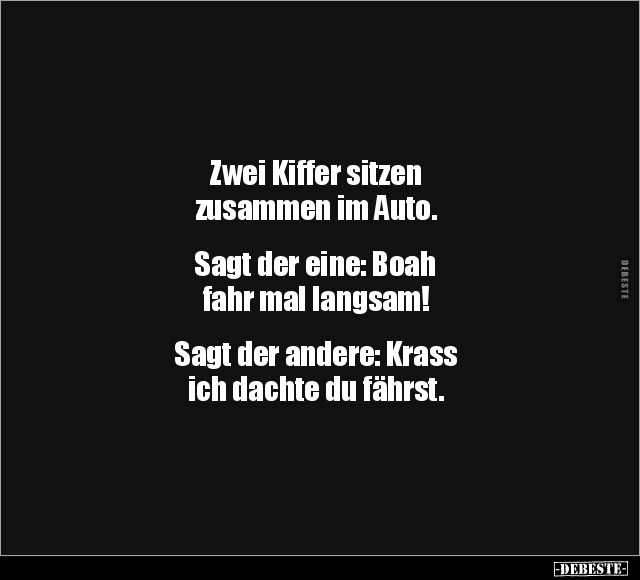 Zwei Kiffer sitzen zusammen im Auto. Sagt der eine: Boah fahr mal langsam! Sagt der andere: Krass ich dachte du fährst.